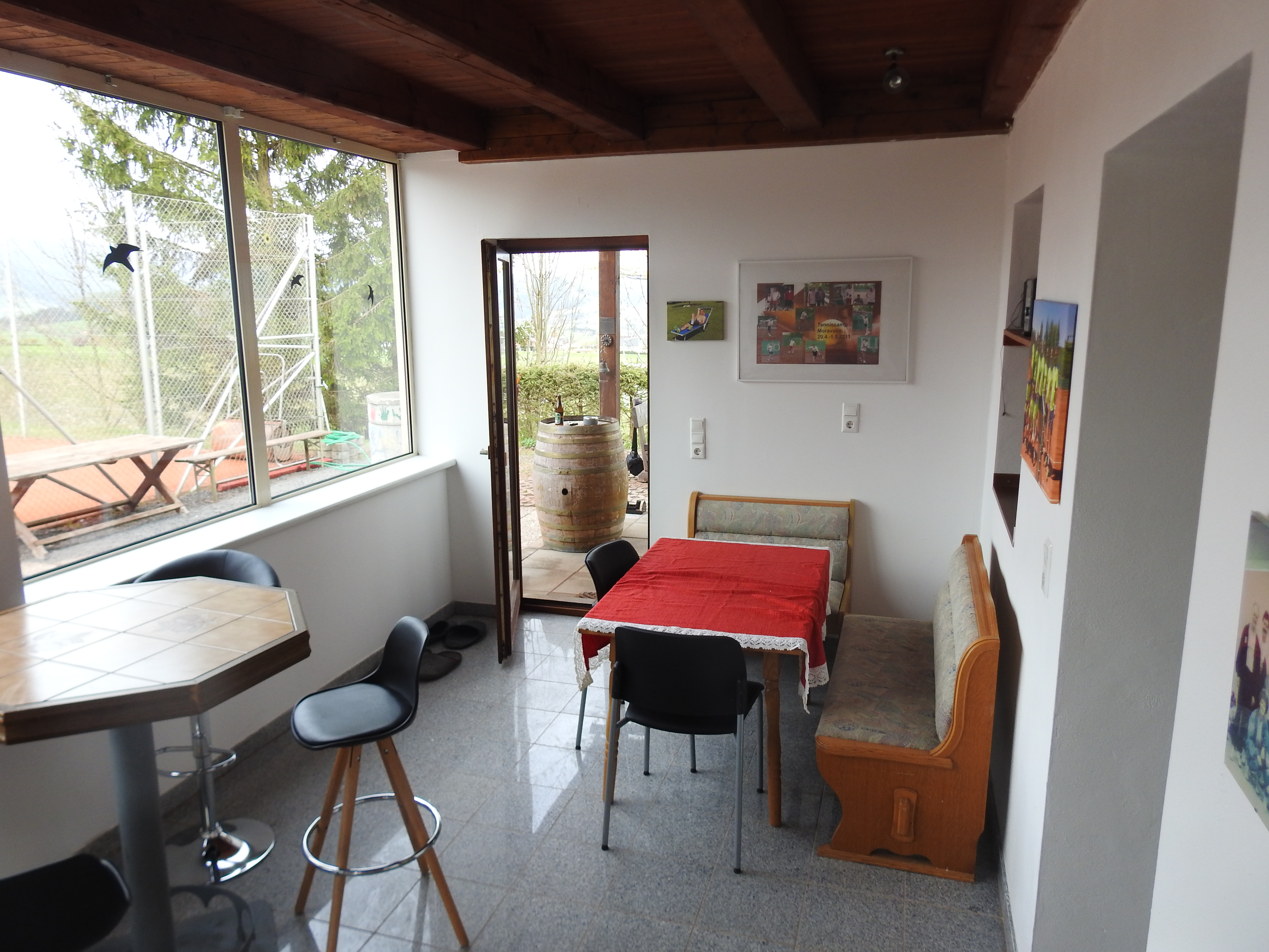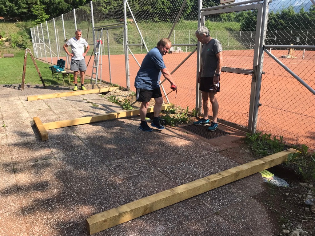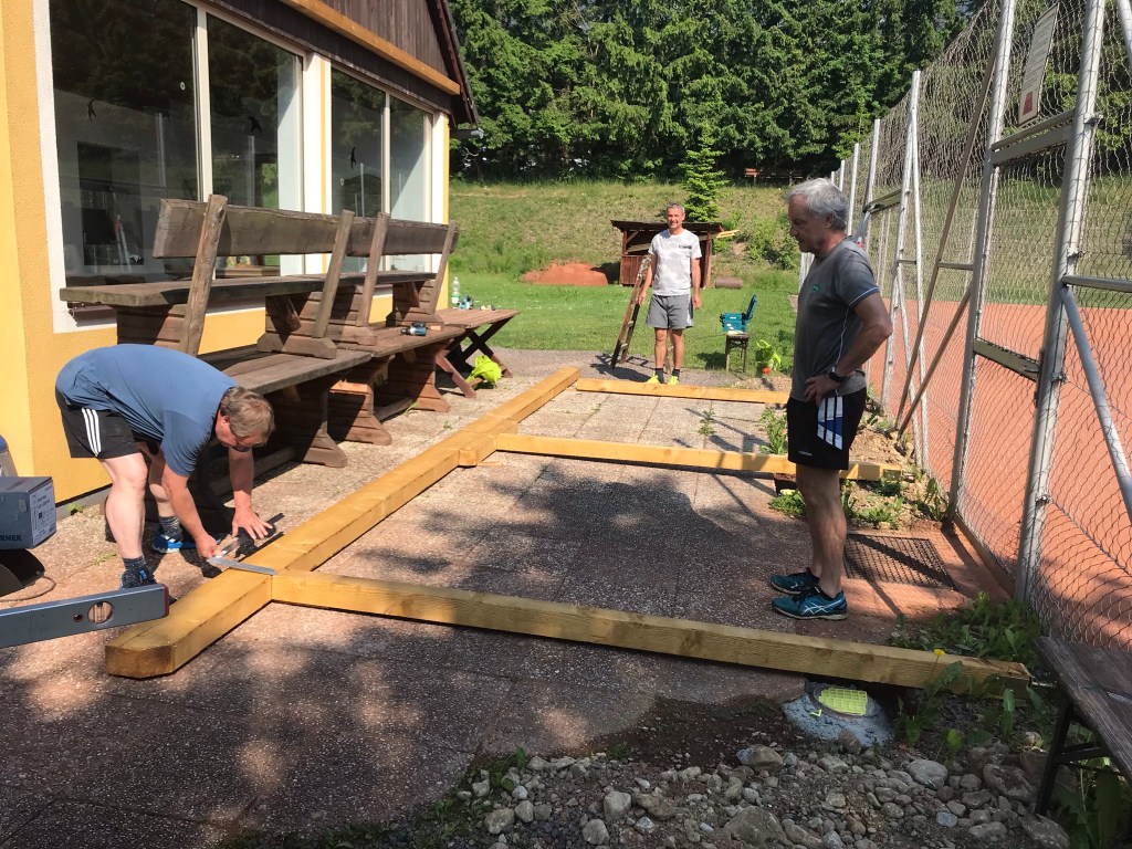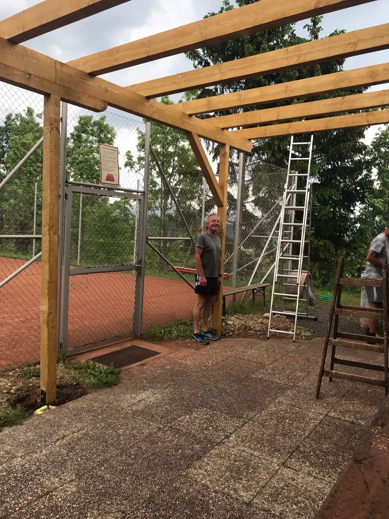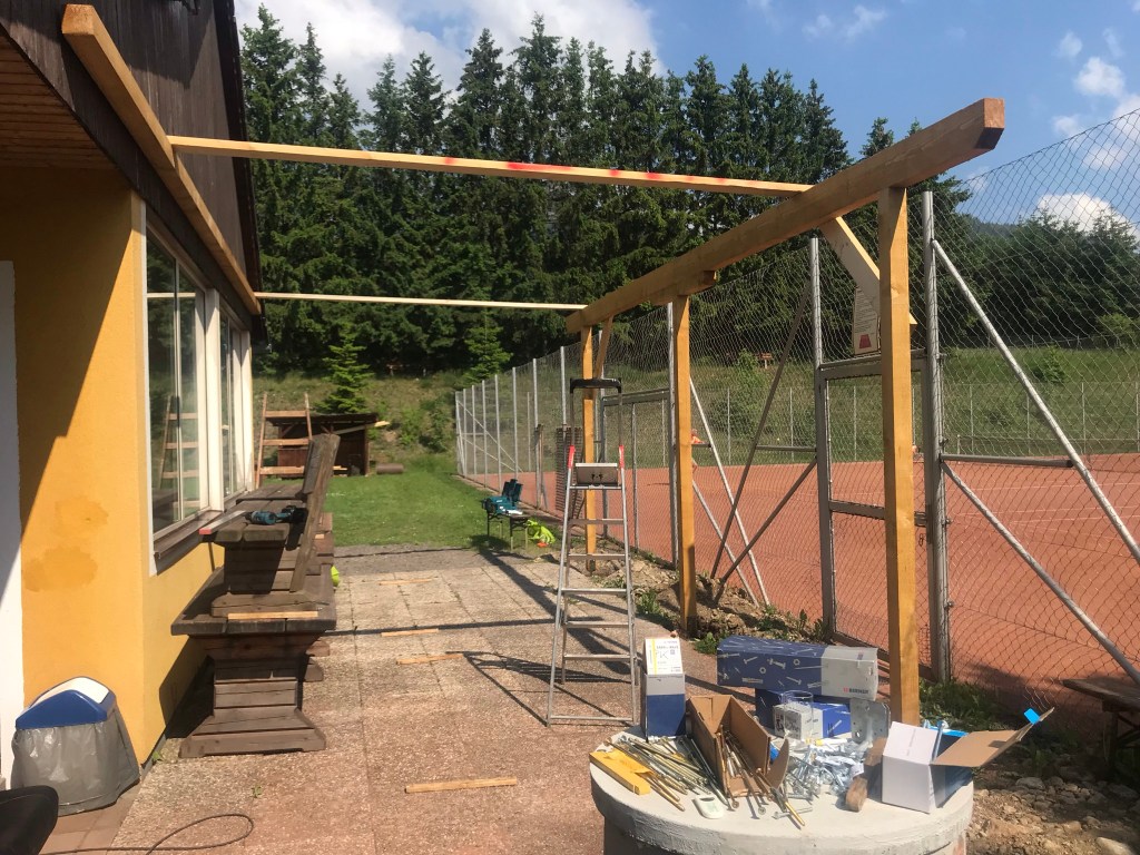 Werte TennismitgliederNachdem wir im Frühjahr neue Sitzgelegenheiten bekommen hatten, diese aber nicht im Freien stehen lassen wollten, reifte die Idee eines Vorbaues auf unserer Tennisanlage.Durch intensive Planung, Beratung, Arbeit und Unterstützung durch Bekannte unseres Vereines konnten wir im Frühjahr mit dem Projekt beginnen. Wir vom Vorstand bedanken uns bei allen Helfern, Berater und Unterstützer die dieses Vorhaben ermöglicht haben. Ohne sie wäre es nicht in dieser Zeit bzw. zu diesen Kosten möglich gewesen diesen Vorbau zu ermöglichen. Möge er in Zukunft uns allen eine Freude bereiten, insbesonders beim Zusehen spannender Spiele oder bei einem Plauscherl nach den Matches.Hier noch ein paar Bilder: